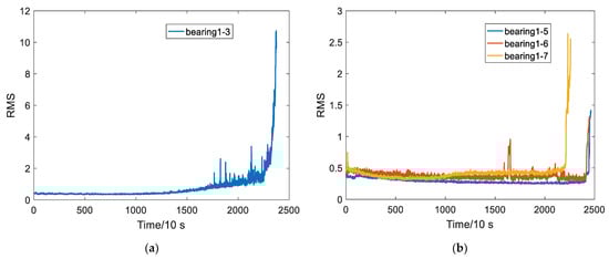Comparison of RMSE metrics for each bearing. (a) RMS index of bearing 1–3; (b) RMS index of bearings 1–5, 1–6, and 1–7.