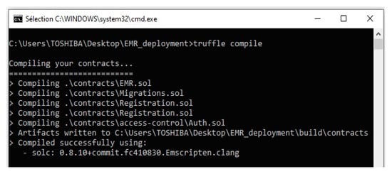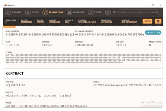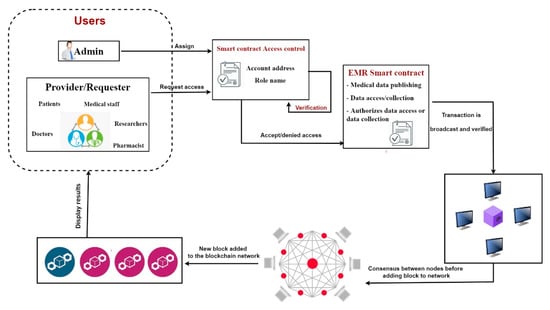 In the EMR system and as shown in Figure 3, several agents exchange information between them. They access a web application to provide or request health information. To access it, they must be authenticated. Depending on the type of user, the smart contract adds the automatic and secure aspect of this transfer. Data that are saved on the blockchain are then displayed on the appropriate interface. Therefore, we try to assign each user an access role thanks to the transparency and immutability of the blockchain to maintain the security of the patient’s data against attacks.