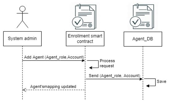 - Agent registration: In this step, the system administrator assigns each agent an account and a role. This designation is recorded in a hash table via a smart contract. The added role is then used when adding an agent or in the handling of transactions in the communication process. However, the deployment of different smart contracts required by our system was the object of this step.