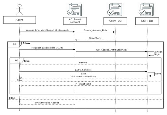 - EMR management: to access and update the patient’s medical data, the healthcare professional agent sends an access request via the smart contract that verifies the identity and rights of the requester and then authorizes them to send a request to the appropriate service.