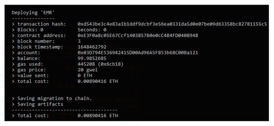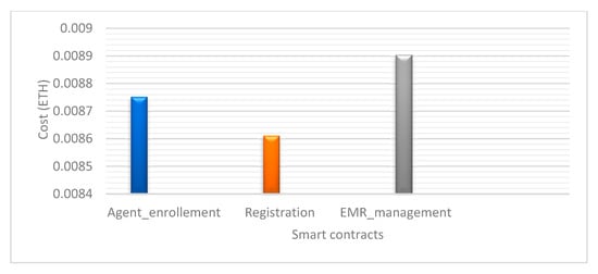 After deploying the smart contracts in our system and as shown in Figure 12, we calculated the cost of each smart contract. The results obtained are in Ether. The execution cost for the EMR management contract is 0.00890416 ETH while the cost for the registration contract is 0.0086118 ETH and for the agent enrollment contract is 0.008752 ETH. We notice that the cost of the EMR_management contract is higher than the other contracts. This contract contains the main functions of the system, such as adding patient analyses as well as the access control functions ABAC and RBAC. While the registration contract occupies less gas consumed since it just assigns a role to the agents in a table containing the accounts and roles. Agent_enrollment contract takes care of adding the relevant information to each agent.