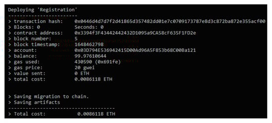 Figure 7, Figure 8, Figure 9 and Figure 10 depict the compilation and migration of smart contracts to the blockchain ganache. Four smart contracts are compiled and deployed in the “development” blockchain: EMR.sol, Registration.sol, Auth.sol and Migration.sol. The entire cost of this transaction, as shown by the migration result, is 0.01751596 ether, which is the equivalent of £ 58.61. This conversion was conducted on 28 March 2022. Following the transfer of our smart contract, we will build a local virtual server holding the client-side application using the truffle framework. To join our blockchain network, we need to connect to our Metamask portfolio.