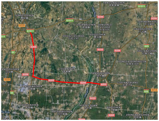 The images of the pavement cracks were collected from various roads, mainly in Linyi City, Shandong Province. The specific site was in Lanshan G205 and Hedong G205, as shown in Figure 2.