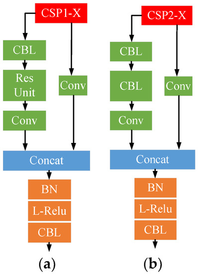 The architecture of CSPNets in YOLOV5: (a) CSP1-X; (b) CSP2-X.