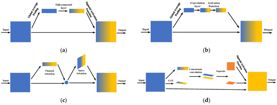 The structure of attention modules: (a) SENet; (b) ECANet; (c) CBAM; (d) CoordAtt.