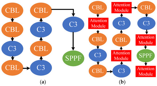 The architecture of backbone in YOLOV5: (a) the original backbone; (b) the improved backbone with attention modules.