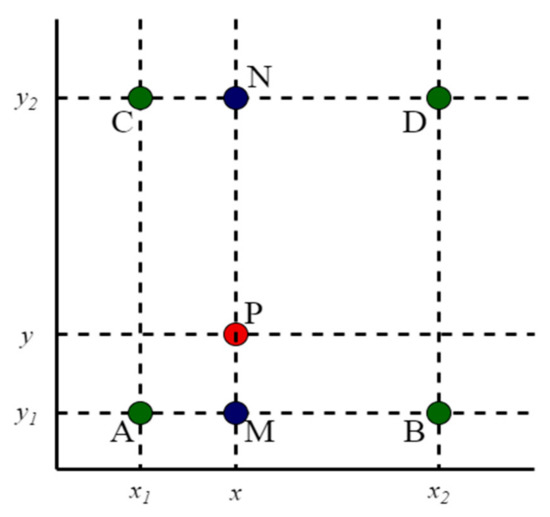 Among the known pixels are , , , . First, we calculate the insertion point M from the two known points A and B in the x-axis direction. In the same way we can calculate the insertion point N between the two points of C and D. We calculate the insertion point P by finding the known point M and N in the direction of the axis, and the P point is our final point to be inserted. By assuming the value of point P, the result of the interpolated point P is shown in Equation (1). Additionally, because A, B, C, and D are all adjacent points, the denominator in Equation (10) makes the algorithm faster.