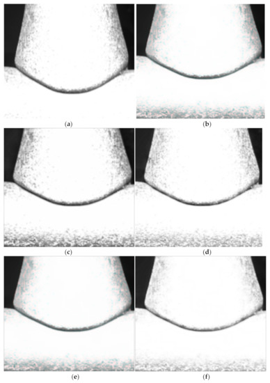 As shown in Figure 7a, there are many noise points in the original figure, and there are irregularities in the edges of the weld. Figure 7b shows some improvement in image noise after bilateral filtering, but the edges of the weld are not smooth and clear. The CLAHE algorithm in Figure 7c has more noise points due to the large amount of noise present in the original image. In Figure 7d Document [14], the algorithm shows that the image noise point is slightly reduced, but the edges are still blurry. In Figure 7e Document [17], the algorithm shows that the image noise points are greatly improved, but the edges are not sufficiently clear. Figure 7f is visibly different to other algorithms; the image has relatively fewer noise points, sharper and smoother edges, and higher image contrast. As can be seen from Figure 8f, the noise points of this algorithm are effectively improved compared to other algorithms, the edges of the weld seam have become smooth and clear, and the contrast of the image has been improved.