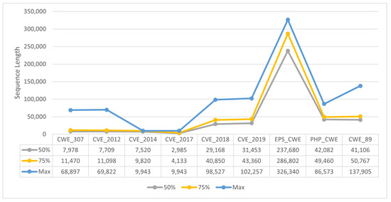 To ensure the input layer obtains the input data in an acceptable format, some preprocessing steps were needed, specifically, tokenization, feature extraction, and padding/truncating. Tokenization involves breaking down sequences of terms into tokens which are then given numeric representation. In this work, we represent each term (system call) by their serial number in the system call table (http://manpages.ubuntu.com/manpages/focal/man2/syscalls.2.html (accessed on 20 September 2021).) For example, system call “_llseek" in the list has a representation of 1. To keep things simple, we are going to use an n-gram as our choice for feature extraction in this work, setting . Finally, padding/truncating is needed because sequences are usually of variable length and our case in this work is not different. We are going to set a maximum length beyond which sequences become truncated and zero pad sequences shorter than the maximum length. The situation in our dataset will guide us into picking the correct maximum length that does not lead to loss of important data.