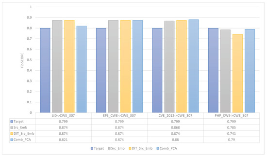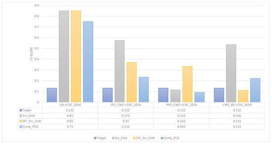 Furthermore, the other three source domains for each of the target domains produced improvement of the target domain that is consistent with their similarity scores, especially in the application of DIT_Src_Emb technique. For example, when paired with , potential source domain recorded the highest similarity score of 0.479089, recorded the second-highest score of 0.439176 and recorded the third-highest score of 0.425669. As seen in Figure 8, the performance improvement of resulting from these three source domains with DIT_Src_Emb technique are (EPS_CWE->CVE_2014:0.37, PHP_CWE->CVE_2014:0.33 and CWE_89->CVE_2014:0.11).