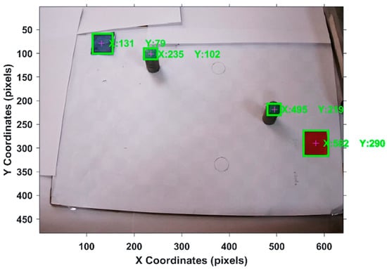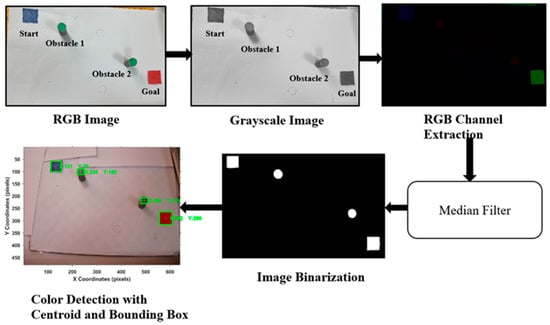 Once the calibration was completed, the camera frames were captured, and the RGB image was converted to grayscale and a particular channel, namely green, blue, and red channels, were extracted from the RGB data using the image subtraction technique where pixel values were subtracted to segment the particular part in the image. Once the single channel was extracted, 2D median filtering was applied to remove the salt and pepper noises present in the image and pads with zeros to preserve the edges. Further, the grayscale image was converted to black and white with the threshold values of 0.05, 0.18, and 0.1 for green (obstacles 1 and 2), red (goal), and blue (start) detection, respectively. Finally, image blob analysis was carried out to find the bounding box coordinates and centroid values of the objects in pixels. The process flow diagram for color-based detection using image processing is shown in Figure 3.