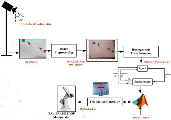 In general, industrial robots operate faster and more precisely than humans, particularly in an assembly line where robots perform repetitive tasks. Hence, to find the shortest or optimal path between two points, path-planning is an important primitive for autonomous industrial robots. Solving path planning is important for ensuring efficient robot control and obstacle avoidance []. Path planning cannot always be designed in advance as the global environment information is not always available a priori, especially in a complex industrial environment. By proposing a proper algorithm, path planning can be widely applied in partially and unknown structured environments where the robot can adapt to changes in the environment [,]. Traditional path planning requires knowledge about the environment and robots cannot learn in complex environments []. Hence in recent years, various methods for planning the waypoints have been developed that involve the use of artificial intelligence techniques and heuristic approaches. However, with the increasing complexity of the working environment, different obstacles of varying sizes exist [,,]. So, to address the above issues, the model-free reinforcement learning approach is used for path planning where the robot generates the optimal path through trial and error in a limited workspace. The reinforcement learning algorithm uses the Markov Decision Process (MDP) where the probabilities and rewards are unknown. For this purpose, a specific function is formulated which optimizes the rewards based on the actions through trial-and-error. Moreover, reinforcement learning is majorly used in mobile robot simulations but has been less explored in manipulators with a restricted workspace because of its complexity. The methodology proposed in this work can be used for assembly line operations in industries where repeated jobs take place in a limited workspace area. To simulate the industrial scenario, an experimental environment with multiple obstacles was created where the workspace area was fixed based on the camera field of view. Further, obstacle avoidance was carried out because multiple obstacles may be encountered while performing assembly operations. The modeling of a 5 DOF manipulator is also covered as it was necessary to implement the task efficiently [,]. In this analysis, movement along z was not considered so as to operate the robot in safe manner. This methodology could also be extended to 3D path planning.