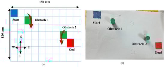 The reachable robot workspace considered for the analysis was (180, 126) mm. This workspace was visualized as grids of 7 × 10 for ease in simulation analysis where each grid in the simulation was equivalent to the center point of four smaller square grids of size 18 mm. Specific colors were chosen for the start, goal, and obstacle positions. The blue object was taken as start position with a grid value of (1, 1); the red object was taken as goal position with a grid value of (5, 9); the green object was taken as obstacle position with grid values of (2, 3) and (4, 8), respectively. The environment generated in MATLAB is shown in Figure 5 where Figure 5a is the simulated environment chosen for the reinforcement learning model and the real-time grid world environment is shown in Figure 5b.