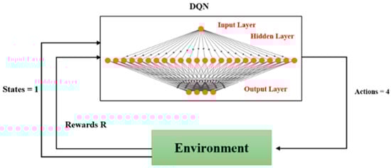 DQN is also a model-free RL algorithm where the modern deep learning technique is used. DQN algorithms use Q-Learning to learn the best action to take in the given state and a deep neural network or convolutional neural network to estimate the Q value function []. The state is given as the input and the Q-value of all possible actions is generated as the output. In this work, Long Short Term Memory (LSTM) which is one of the Recurrent Neural networks was used as a function approximator to map the states and actions instead of Q table. The DQN uses the Bellman equation to update the q value and it is given by
