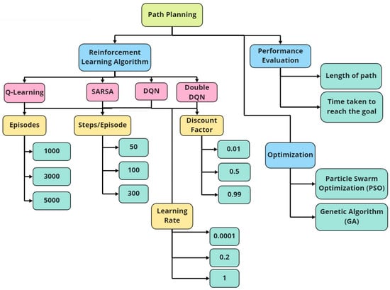 In this section the performance of different reinforcement learning algorithms implemented in this paperwork is discussed. The training hyperparameters namely episodes, steps per episode, learning rate, and discount rate were varied randomly and for each case the length of the optimal path obtained from reinforcement algorithms and the elapsed time to reach the goal point were calculated []. Furthermore, analysis was extended to apply PSO and GA for optimizing the training hyperparameters instead of randomly varying the training parameters. Moreover, performance for path planning using optimal parameters was compared with standard random values and also implemented in real-time experimentation. The detailed performance analysis implemented in this work is shown in Figure 7.