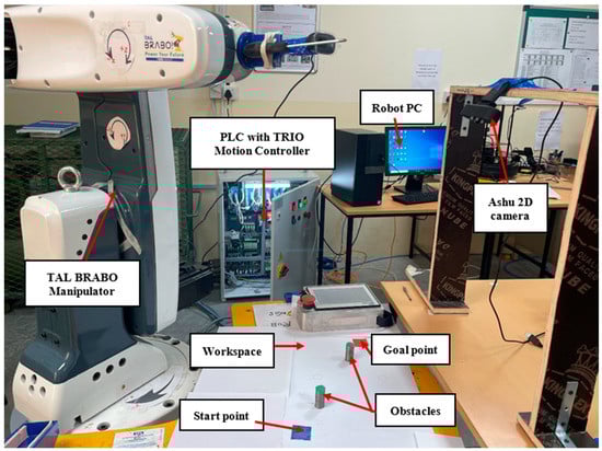 This section presents various results obtained for different test cases for different reinforcement learning algorithms. Their performance was compared, and an optimal set of parameters was chosen for real-time experimentation using TAL BRABO manipulator. The experimental setup for performing vision-based path planning and obstacle avoidance is shown in Figure 8.