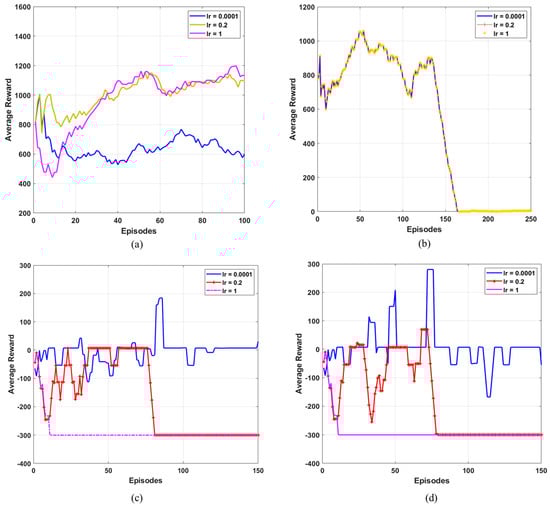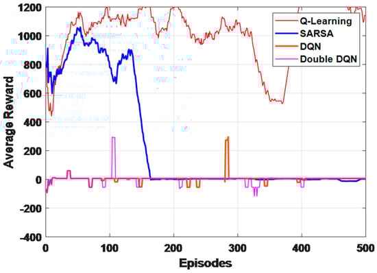 From the graph, it can be seen that Double DQN converged faster within 40 episodes whereas Q-Learning performed worse since it never seemed to converge. Secondly, DQN and SARSA also converged faster at 150 and 170 episodes, respectively, compared to Q-Learning. It can be inferred that Double DQN performed better among all. Figure 11a–d depicts the average reward obtained with different learning rates such as 0.0001, 0.2, and 1 for different RL algorithms. It was inferred that the average reward of Q-Learning varied without converging to a specific value but the average reward of SARSA took 155 episodes to converge. However, for DQN and Double DQN it converged within 85 episodes. This shows that the convergence speed was faster for the deep learning-based Q network.