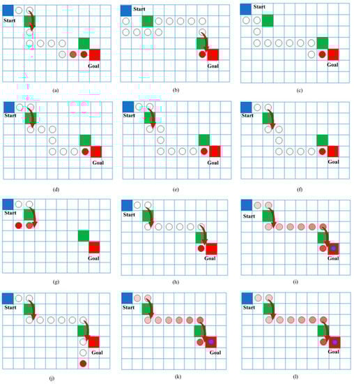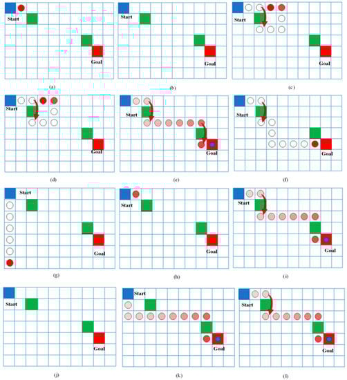 Further, Figure 12a–c denotes the different optimal paths taken by the agent for Q-Learning for steps 50, 100, and 300, respectively. Similarly, Figure 12d–f shows the agent path using SARSA for 50, 100, and 300 steps, respectively. Figure 12g–i describes the path using DQN for 50, 100, and 300 steps, respectively and finally Figure 12j–l shows the path obtained from Double DQN for 50, 100, and 300 steps, respectively. The agent tries to reach the goal point by moving from one grid to another by trial-and-error during learning process. When it encounters an obstacle, a jump is made from one grid to another to find the optimal path in less time which is denoted by red arrow. Here in this paperwork, the agent movement around the obstacle was recorded which could be further used for calculating the probabilities of the future states. The transition jump around the obstacle was taken as 1 and other surrounding grids were made zero so that it did not visit that grid because it was seen that when it reached nearby grids, time to reach goal was more and sometimes it did not reach the goal. Then it was seen that Q-Learning and SARSA were not able to reach the goal point exactly but reached the grid before the goal point which approximated to an 18 mm difference in robot workspace. However, DQN and Double DQN performed better and reached the goal point exactly, which showed that deep reinforcement learning performed better than conventional reinforcement learning algorithms. Hence, steps per episode played a major role as they recorded the state and reward for the state–action pair.