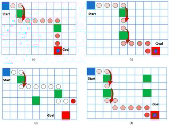 The problem was formulated as an unconstrained nonlinear optimization problem. Similarly, a particle swarm optimization algorithm was also used to compare the optimized results of GA and PSO and their effect on agent path traveled. In PSO, the swarm size was taken to be (100, 40) with an initial swarm span of 2000. The total iterations were chosen to be 800. The initial weights of each particle with respect to the neighbors’ particles were taken as 1.49. The optimized parameters were obtained from GA and PSO and one of the solutions is listed in Table 6. Finally, these parameters were implemented on different reinforcement learning algorithms, and the paths traced were analyzed.