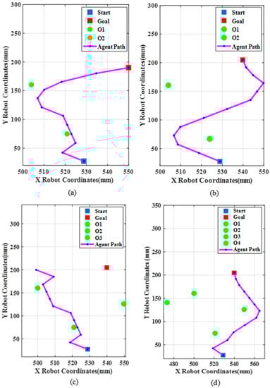 The length of the path was calculated based on the Euclidean Distance calculated between two points at every step progressing towards the goal point. Moreover, the elapsed time was calculated which reveals how long the agent has taken to reach the goal point []. In reinforcement learning, during each episode, the sequence of states, actions, and rewards varies from the initial state to the terminal state to maximize the rewards; hence, it is one of the important training parameters considered for performance analysis. The next parameter which is varied is the steps per episode which denote the number of steps or iterations per episode.