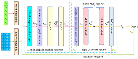 The overall framework of our model consists of two main parts: the mention association graph and the candidate entity association graph. The mention association graph is generated from the mention full connectivity graph and represents the classification relationship of the topic. Different mention association graphs can be used to extract the potential semantic features of the mention collected by our variant GNN. Furthermore, this semantic feature is used as the association feature of the current topic. The candidate entity association graph comprises all the candidate entities under the current topic and the obtained mention entity association graph features. Then, the global coherence features of the current topic are obtained through the graph attention network (GAT). Finally, the global score of each candidate entity under the current mention set is calculated based on the similarity between the coherence feature of the current topic and the representation vector of each candidate entity. The overall architecture of our model is illustrated in Figure 1.