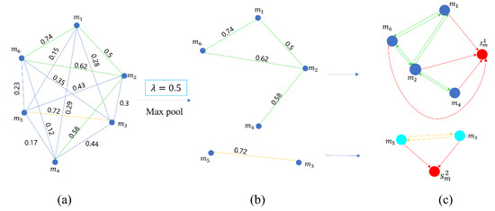 After obtaining the set of all mention hidden representations () of the current document (), the full mention connection graph () is built. We use the mention set () of the current document () as the node () of the graph. The set is obtained by making a Cartesian product of with itself as a set of edges (). The weight value of each edge in the graph is obtained by calculating the cosine similarity between the two mention representation vectors. The final composition of the full connection mention graph is shown in Figure 3a.