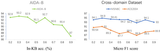 The similarity threshold value for mention pairs is crucial for our model. This threshold value determines the number of mention association graphs for each document after max pooling the fully connected mention graph with the number of topics in the same document. The number of mention association graphs in the document is dynamically adjusted according to the learning of the mention embedding vector, which partly weakens the influence of the artificially defined threshold size on the model and enhances the robustness of the model. The impact of the threshold size on the performance of our model is detailed in Figure 5. According to Figure 5, the best results are obtained when the threshold value is 0.3 for both the domain and the cross-domain datasets. The corresponding edge in the fully connected mention association graph is disconnected when the cosine similarity between two entity mention pairs is less than 0.3. Through experimental observation, most of the association graphs mentioned by fully connected entities are divided into two subgraphs, with some small cases of three subgraphs. However, there are few cases with no division. This confirms our suspicion that there are multiple topics in a document.