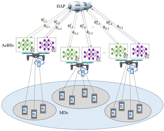 Figure 1 depicts our scenario in an aerial edge computing network. There are M MDs, N low-altitude AeBSs, and an HAP in the system. For simplicity, we abbreviate low-altitude AeBSs as AeBSs and consider all AeBSs and MDs to be computationally capable, and additionally, we used a binary offloading strategy for the computational tasks, i.e., offloading to AeBSs or executing them locally [39]. AeBSs perform local training, and the model parameters are uploaded to an HAP for federated model aggregation. We chose an HAP as a global node because of its powerful computing power and lower latency compared to satellites. In addition, there are almost no other obstacles in the air except the aircraft itself, which makes the communication link better and more reliable than the ground communication. AeBS n trains its own two networks and together, in which is responsible for deployment and is responsible for the offloading policy.