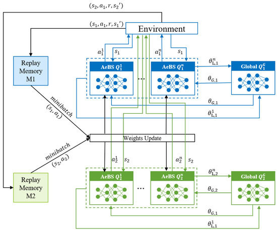 After each AeBS trains its two networks based on its state, it uploads the parameters of and to the HAP for model aggregation at regular intervals . The parameter is set because it is unnecessary for AeBSs to upload model parameters to the HAP for each episode of training to save costs. The weight of the global model can be obtained as follows: