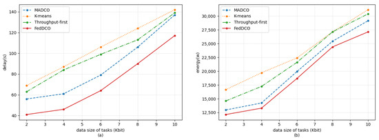 Comparison of network performance metrics at different data sizes of the tasks. (a) Task processing delay. (b) Energy consumption.