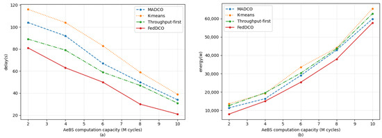 Comparison of network performance metrics at different computational capacities of the AeBSs. (a) Task processing delay. (b) Energy consumption.