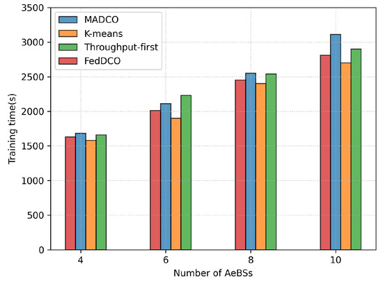 Figure 7 shows the training time of FedDCO, MADCO, K-means, and throughput-first with different numbers of AeBSs. As the number of AeBSs in the system increased, the problem complexity increased, so the training time of FedDCO and MADCO also increased. The training time of FedDCO was smaller than that of MADCO and throughput-first, which indicates that federated learning can accelerate convergence and improve algorithm efficiency. This is owed to the fact that federated learning can solve the problem of the difficult convergence of agents by exchanging experience through parameter aggregation. In the K-means-based scheme, the K-means algorithm was adopted to decide the deployment position of the AeBSs instead of training a DRL model, which made its training speed relatively fast. Especially when the number of AeBSs increased, this gap became larger. However, the performance of the K-means-based scheme was not as good as FedDCO.