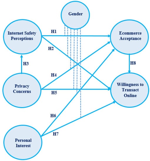 The study by Cheryan et al. [] brought attention to the significance of gender differences, which can have a significant impact on whether men and women accept technologies. The present research also considers how gender differences affect people’s willingness to transact online and e-commerce acceptance. The purpose of this research is to ascertain whether there are differences between men and women perceptions of Internet safety, privacy concerns, and personal interests. These variables may differ by gender, and gender differences act as a mediating variable among other variables. To the extent of our insights, prior studies have relied on the cultural dimensions of Hofstede as their primary conceptual model; however, the present research tries to look into the acceptance of e-commerce using a hybrid conceptual model in which gender difference plays the role of a mediator.