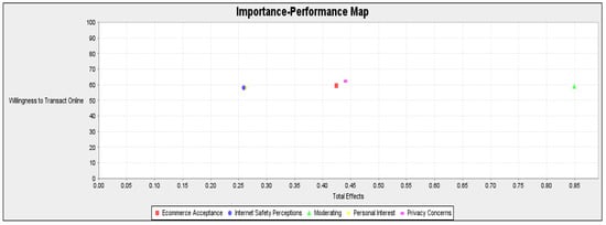Ringle and Sarstedt [] claimed that IPMA facilitates the understanding of PLS-SEM study data. In this research, the objective factor was behavioral intention, and the IPMA was applied as an effective method in PLS-SEM. In addition to assessing the path coefficients (such as the importance measure), IPMA also incorporates the overall average of the latent constructs and their metrics (such as performance measures) []. The IPMA states that the average of the scores of the latent constructs shows the performance, whereas the actual effect indicates the significance of prior factors in creating the target factor (willingness to transact online). PI also has the lowest score on the performance measure, despite having the third-highest score on the importance measure. It is vital to remember that SP has the minimum importance measure, even though it is a performance measure as shown in Figure 2. Figure 3 provides a visual representation of the IPMA results. In this research, the importance and performance of the four variables (EA, PC, PI, and SP) were evaluated. The results show that PC has the highest scores for both the importance and performance metrics. EA has the second-highest scores in importance and performance metrics, which is also important to note.