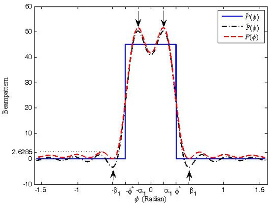 Where is micro-adjustments to the desired beampattern . The criteria 1–2 derive from the basic requirements of the desired beampattern [27]; criteria 3 derives from the transmit beampattern that can be expanded with finite Fourier series; as M increases, the mean square error between transmit beampattern and will tend to zero, so we have criteria 4. In order to obtain a good matching transmit beampattern with higher MSLR, all four criteria are necessary for the micro-adjustment to the desired beampattern.