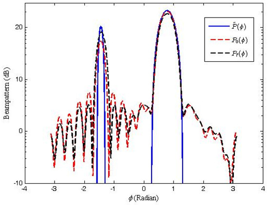 Lemma 1 shows that is the minimum mean square approximation to in all M-1 trigonometric polynomial. It is obvious that satisfies criteria 2–4. However, according to [27], the desired beampattern and its finite Fourier expansion have the same optimal transmit beampattern . Therefore, if cannot satisfy the MSLR constraint, we need to explore other approach to increase MSLR as well as meet the four criteria.