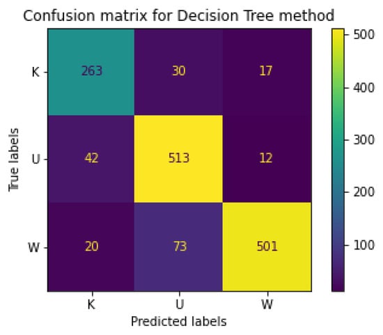 Figure 2 displays the distribution of the classification results obtained for the logistic regression algorithm. The maximum TP value was produced for the U category (506), with minimal misclassified LOs for K (0) and W (85). W-category classification reached a decent TP value (473), while a substantial number of misclassified LOs fell into U (146); however, none fell into W. The weakest results were achieved for the K category, with only 15 TP values coupled with 255 misclassified LOs for U and 53 for W-claimed labels.