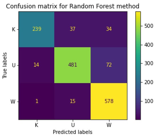 Figure 4 shows the distribution of the classification results obtained for the random forest algorithm. With the RF classifier, max TP was obtained for the W category (578), with just 1 misclassified LO that fell into K and as few as 15 that fell into U. U-category classification reached max TP value (481) coupled with a small number of misclassified LOs that fell into K (14), while 72 fell into W. The results achieved for the K category reached 239 while 37 misclassified LOs fell into U, and 34 fell into W-claimed labels.