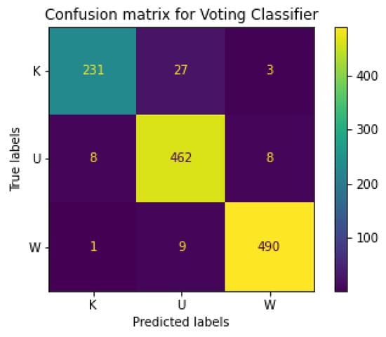 Confusion matrix for hybrid voting classifier, where W—knowledge, U—skills, and K—responsibility and autonomy. Color scale ranges from dark purple for 0 matches to light yellow for maximum conformance of prediction with the claimed labels.