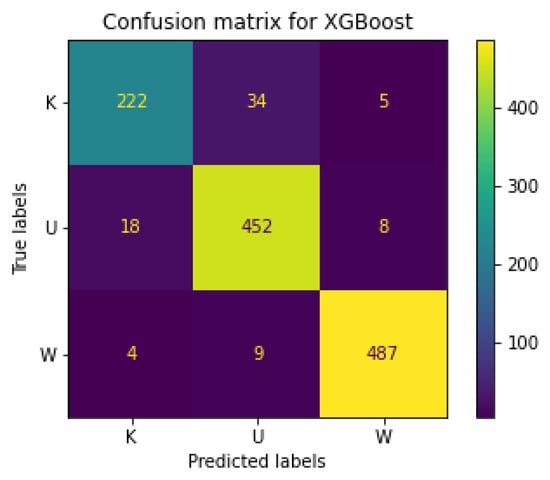 Figure 6 shows the distribution of the classification results obtained for the XGBoost algorithm. With the XGB classifier, max TP was obtained for W category (487), with just four misclassified LOs that fell into K and as few as nine that fell into U. U-category classification reached a max TP value (452) coupled with small number (18) of misclassified LOs that fell into K, and just 8 fell into the W category. The results achieved for the K category reached 222 coupled with 34 misclassified LOs that fell into U, and just 5 fell into W-claimed labels.