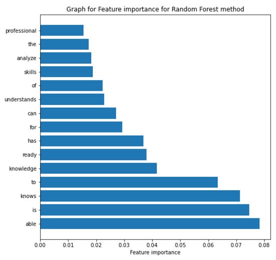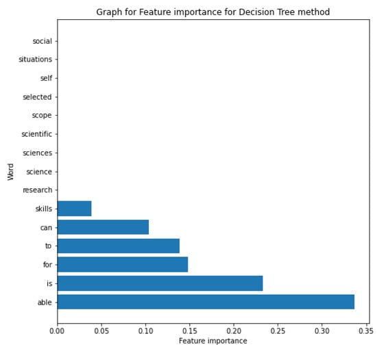 Figure 7 presents the distribution of the keywords’ importance for the decision tree classifier. The word ‘able’ featured as the most impactful. Notably, most of the featured 15 keywords are either not heavy weighted (top half of the diagram) or not very meaningful (prepositions and short words: ‘to’, ‘for’, ‘is’).