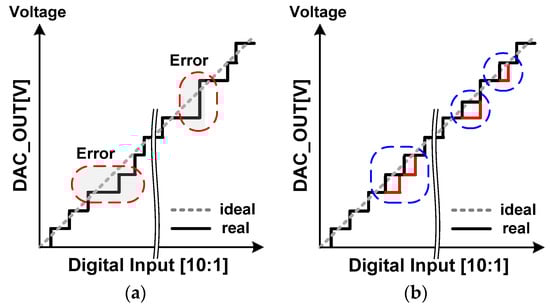 Figure 2 shows a transfer curve of the CDAC. The gray line of the transfer curve is the ideal analog output, and the black line is the analog output generated by the real DAC. The capacitor mismatch in the CDAC worsens its linearity characteristics, as shown in Figure 2a. In this case, as indicated by the red line, overlapping analog voltages or missing analog voltages may be generated as the digital code increases. Figure 2b shows the transfer curve of the CDAC when the mismatch between capacitors in CDAC is ideally calibrated. In this case, the CDAC output outputs a monotonic analog signal, and its output value has quantized analog voltages at regular intervals. As a result, the linearity properties of the CDAC such as differential non-linearity (DNL) and integral non-linearity (INL) are improved. In general, the mismatch of the capacitor corresponding to the upper bit of the CDAC greatly worsens the DNL and INL of the CDAC more than the mismatch of the capacitor corresponding to the LSB. Thus, the proposed C–R DAC calibration calibrates the capacitors of the upper five bits in this work.
