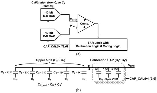 Recently, analog-to-digital converters (ADCs) used in various fields including mobile applications require low power, high resolution, and low area characteristics. A successive approximation register (SAR) ADC has a suitable structure for low-power design because it uses only capacitors, switches, logics, and one comparator without an amplifier consuming a static current [1,2,3,4,5]. However, as the resolution of the SAR ADC increases, the number and area of capacitors increase proportionally to the power of two of the resolutions [6]. A capacitor–resistor DAC (C–R DAC) combined a capacitor digital-to-analog converter (CDAC) and a resistor digital-to-analog converter (RDAC) can be used to reduce the area that increases with increasing resolution of the SAR ADC [7]. Although the SAR ADC uses a C–R DAC to reduce the area, in order to further reduce the area and power consumption of the DAC for the SAR ADC, the unit capacitor of the CDAC generally uses the minimum capacitor which is supported by the CMOS process. In this case, capacitor values are sensitive to process variations and parasitic components [8,9,10]. The mismatch between capacitors used in the CDAC deteriorates the performances of not only the CDAC but also the SAR ADC. A capacitor calibration of a CDAC has been reported for the improvement of a SAR ADC [11,12,13,14,15]. This capacitor calibration for the CDAC requires an accurate comparator that can sense voltages less than 1 LSB without an offset voltage [16].