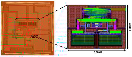 The proposed 11-bit 10 MS/s SAR ADC was designed using a 180 nm CMOS process with a 1.8-V supply voltage. The CMOS process used in this work supports a metal-insulator–metal capacitor of at least 25 fF for the unit capacitor of the C–R DAC. The active area of the proposed 11-bit 10 MS/s SAR ADC is 650 μm × 450 μm, as shown in Figure 7. It was reduced by the use of the C–R DAC. The SAR ADC with a full rail-to-rail input voltage range consumes 583 μW of power when operating at a sampling rate of 10 MHz.