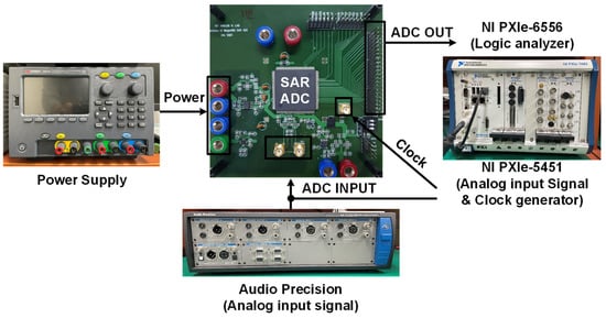 Figure 8 shows the test environment for the implemented SAR ADC. The analog differential input signal and clock signal were sourced from NI PXIe-5451. In addition, Audio Precision equipment was used to supply an analog input signal with a low frequency. The digital output code of the implemented SAR ADC was acquired using NI PXIe-6556. The performance of the 11-bit 10 MS/s SAR ADC was analyzed through signal processing using LabVIEW software for the acquired digital output code.