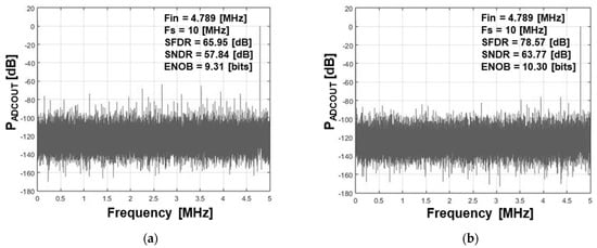 Measured dynamic performances of 11-bit SAR ADC at a differential analog input signal with Nyquist frequency of 4.78 MHz: (a) before C–R DAC calibration; (b) after C–R DAC calibration.