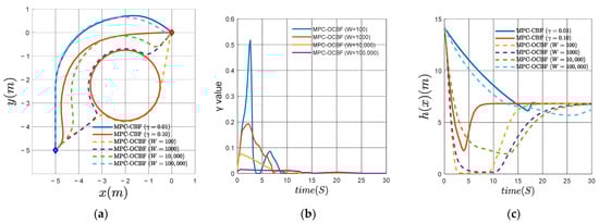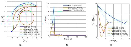 Equation (15a) is used in our MPC-OCBF and the results are compared with MPC-CBF with fixed . For MPC-CBF, two experiments were run with and , respectively. For MPC-OCBF, four experiments were run with the weight matrix , , and , respectively. The results are illustrated in Figure 1.