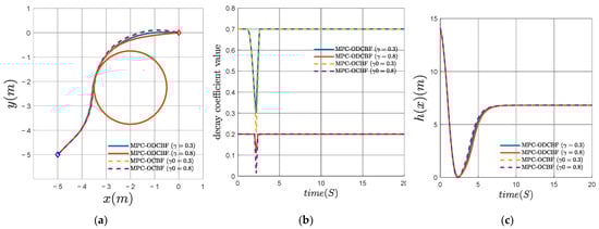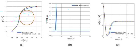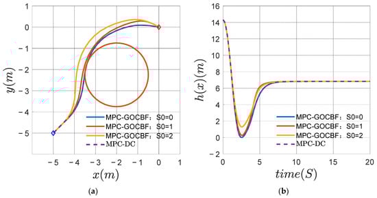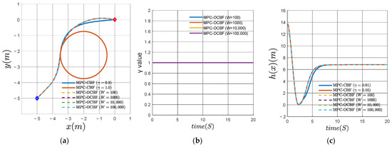 The results of MPC-ODCBF and MPC-OCBF are almost the same in Figure 5. Moreover, the actual decay coefficient is plotted in Figure 5b: in MPC-ODCBF, it is ; in the MPC-OCBF, it is . For MPC-ODCBF, if the variation in is , then the variation in the decay efficient is . For our MPC-OCBF, if the variation in is , then the variation in the decay efficient is . Consequently, if the variation level is the same, i.e., , then because of the inequality relation . This is confirmed in Figure 5b as the results of our MPC-OCBF all have a greater change in amplitude than the MPC-ODCBF results in both examples. Compared with MPC-ODCBF, the optimization in our MPC-OCBF is clearer and more direct to reflect the flexibility to compromise conflicting objects.