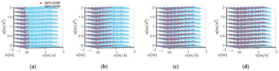 As Equation (14a), the cost part must also be added into the MPC-GOCBF. As with Equation (15c), can be set to prefer certain safety restriction level behaviors. Here, can be used as a safety margin with clear physical meanings predetermined by the user. If is set, our MPC-GOCBF becomes MPC-DC, as the safety constraints are set as . Consequently, our MPC-GOCBF can be regarded as a generalized formulation of both MPC-CBF and MPC-DC.