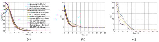 where are the position and velocity of the ego vehicle, is the mass of the vehicle, and is the distance between the ego and the lead vehicle traveling at a velocity of . The aerodynamic drag is represented by , where , and are empirical constants. The CBF and the CLF , here , represents the desired velocity of the ego vehicle. The input control constraint is added as . As in reference [5], the MPC horizon is used to enable fair comparison and it becomes the CBF-CLF-QP formulation. Other than extending the simulation time from 12 s to 30 s, the same parameters as reference [5] were used. Specifically, the ego vehicle is initialized at origin , the initial distance between the ego car and the lead vehicle is set as , and feasibility was tested with varying initial speeds from 26 m/s to 32 m/s. Here, we compare the results of traditional CBF-CLF-QP using fixed , optimal-decay CBF-CLF-QP in reference [5] with preferred value and our GOCBF-CLF-QP with the different user-preferred safety margin and , respectively. The results are illustrated in Figure 8.